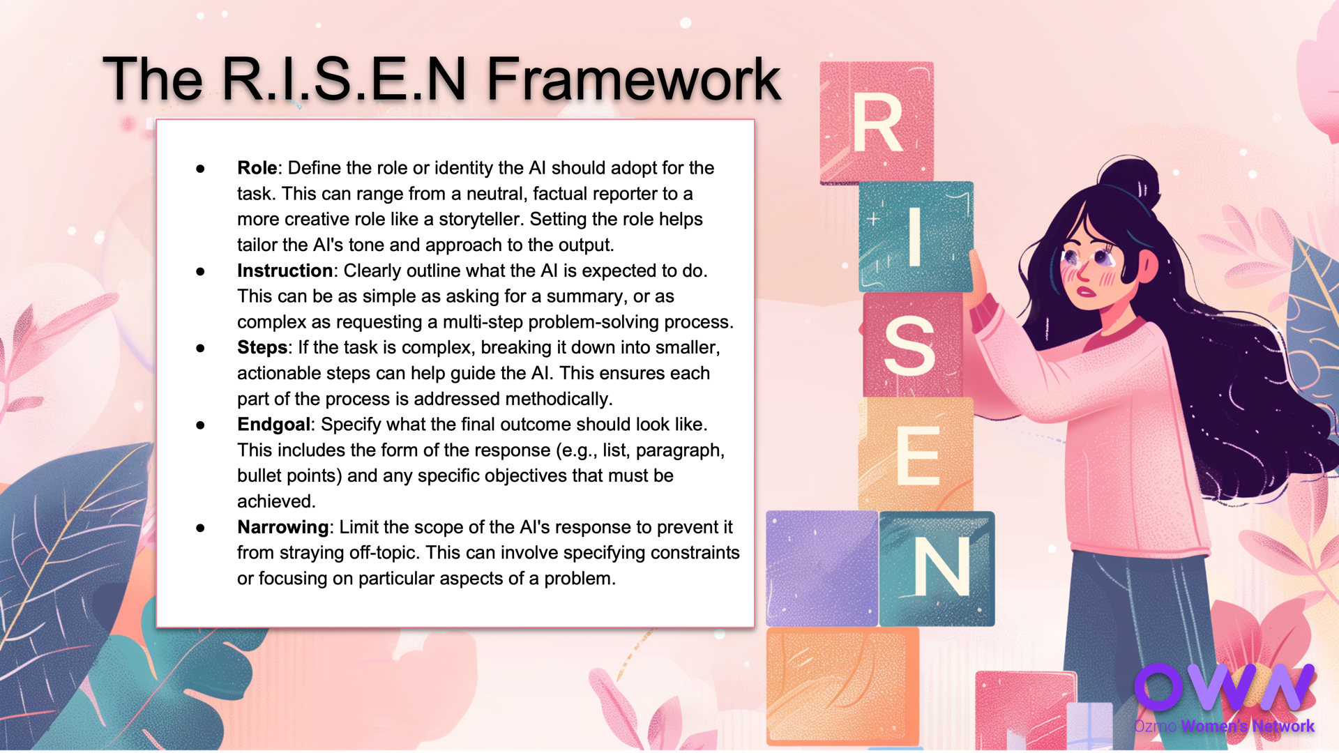 Prompt engineering can be tricky and I’m sure we’ve all been underwhelmed by the output of AI from time to time… It just doesn’t get me, or I can’t articulate what I want. Well there are frameworks out there to help you. RISEN has been my goto when I’m struggling to get AI to give me what I want because it forces me to think about the output and what the AI is capable of. Frameworks and prompt engineering can be a talk on it’s own but for today we’ll structure out prompts in this format. Now let’s see the demo.